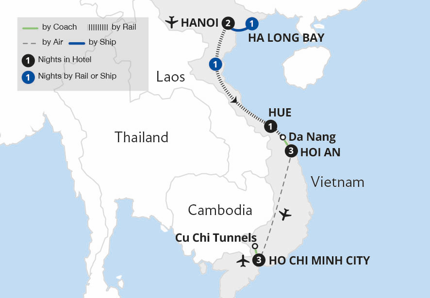Discover the stand-out sights and diverse destinations of Vietnam on this southeastern Asian adventure. Enjoy a street-food experience in Vietnam's capital, Hanoi, and a serene overnight cruise amongst the jungle-draped islands of Ha long Bay. Travelling on the Reunification Express allows us to uncover the laid-back delights of coastal Hue...